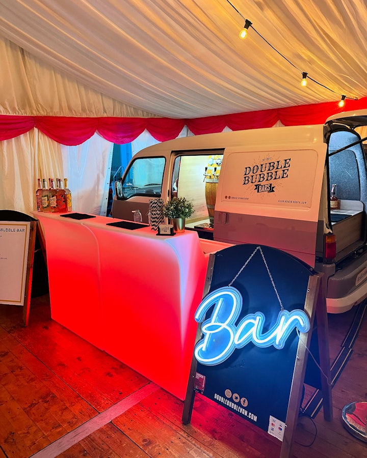 We have the Double Bubble Van which is our mini campervan, that has been lovingly converted into a mobile bar. And our handmade Double Bubble Bike perfect for all events and occasions.